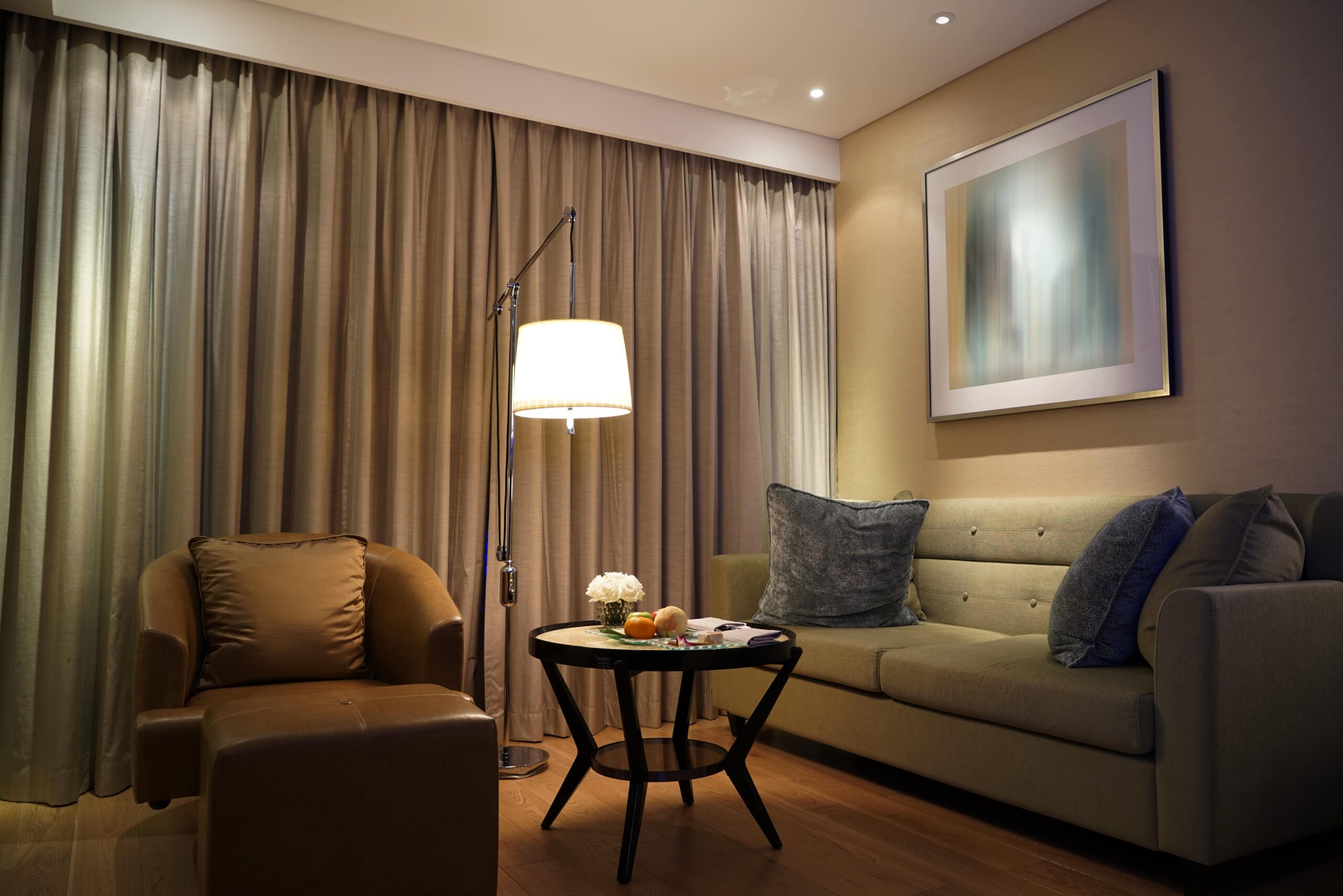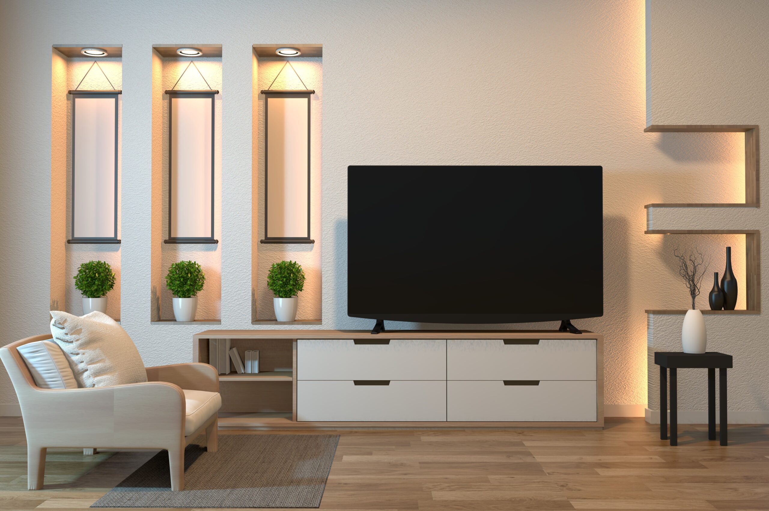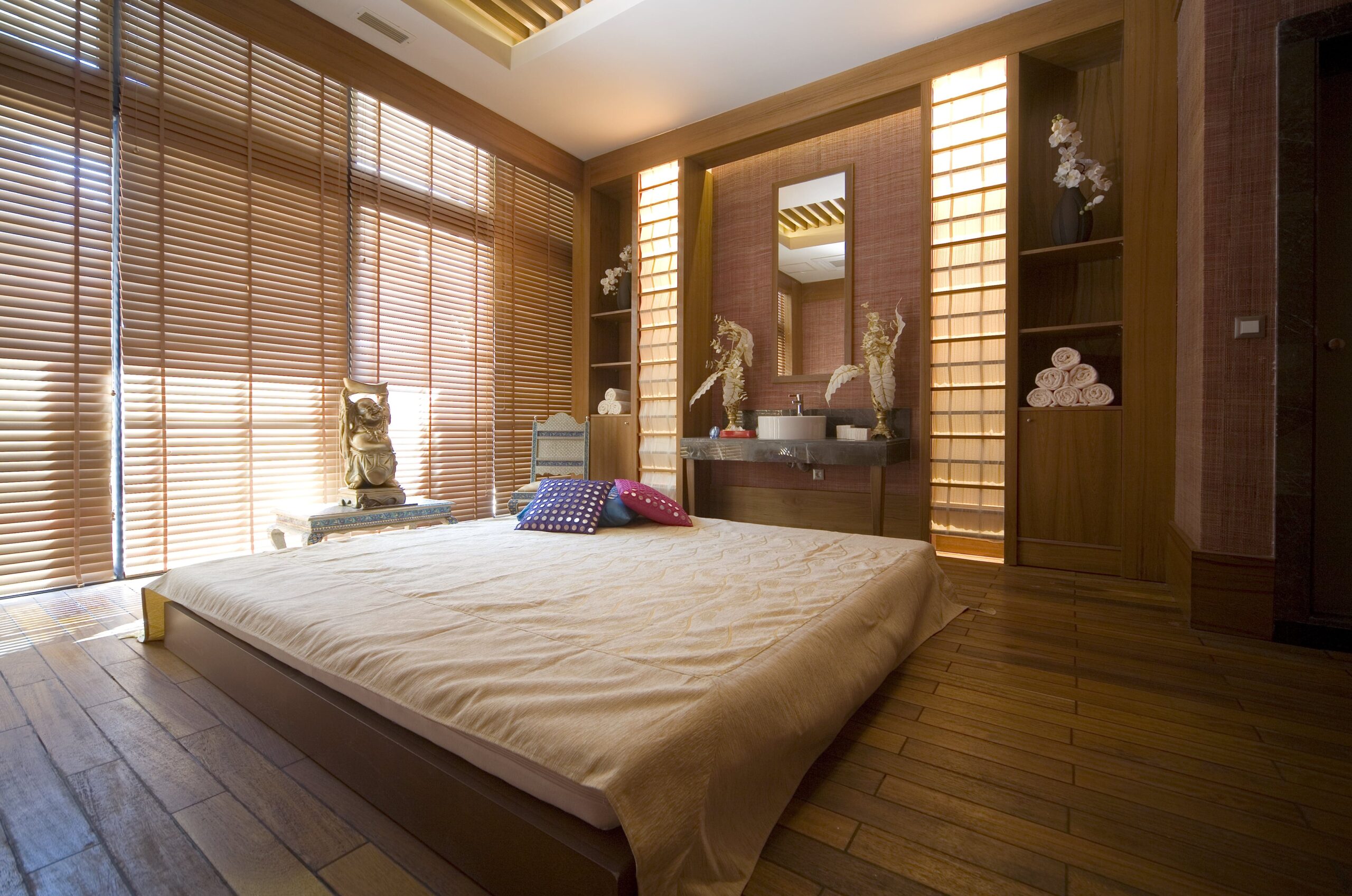 Colours that make the room look spacious and clean are very zen, off-white, beige, sand, browns, tangerine, leafy or zade greens look divine. You can also consider keeping the walls bare if you want to the original zen look. Create harmonious balance through light and warm tones, shades that are close to nature are preferred. Timber or bamboo flooring, stone and porcelain tiles look amazing. Low broad table and Japanese calligraphy art would be ideal for that evening tea.