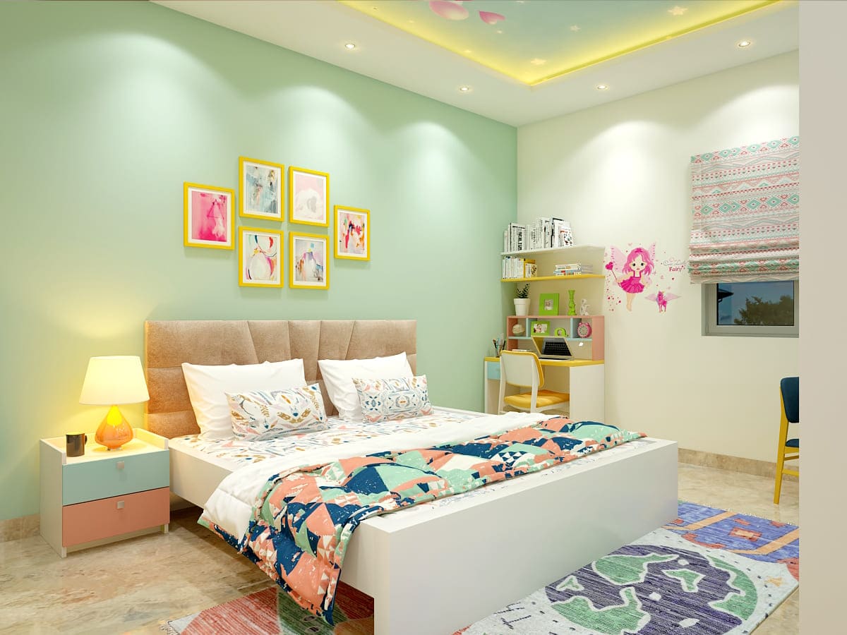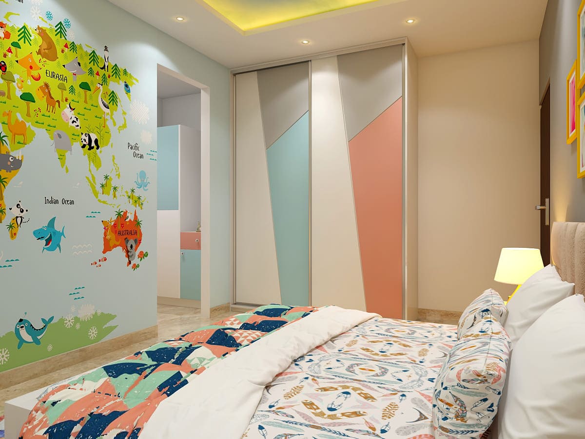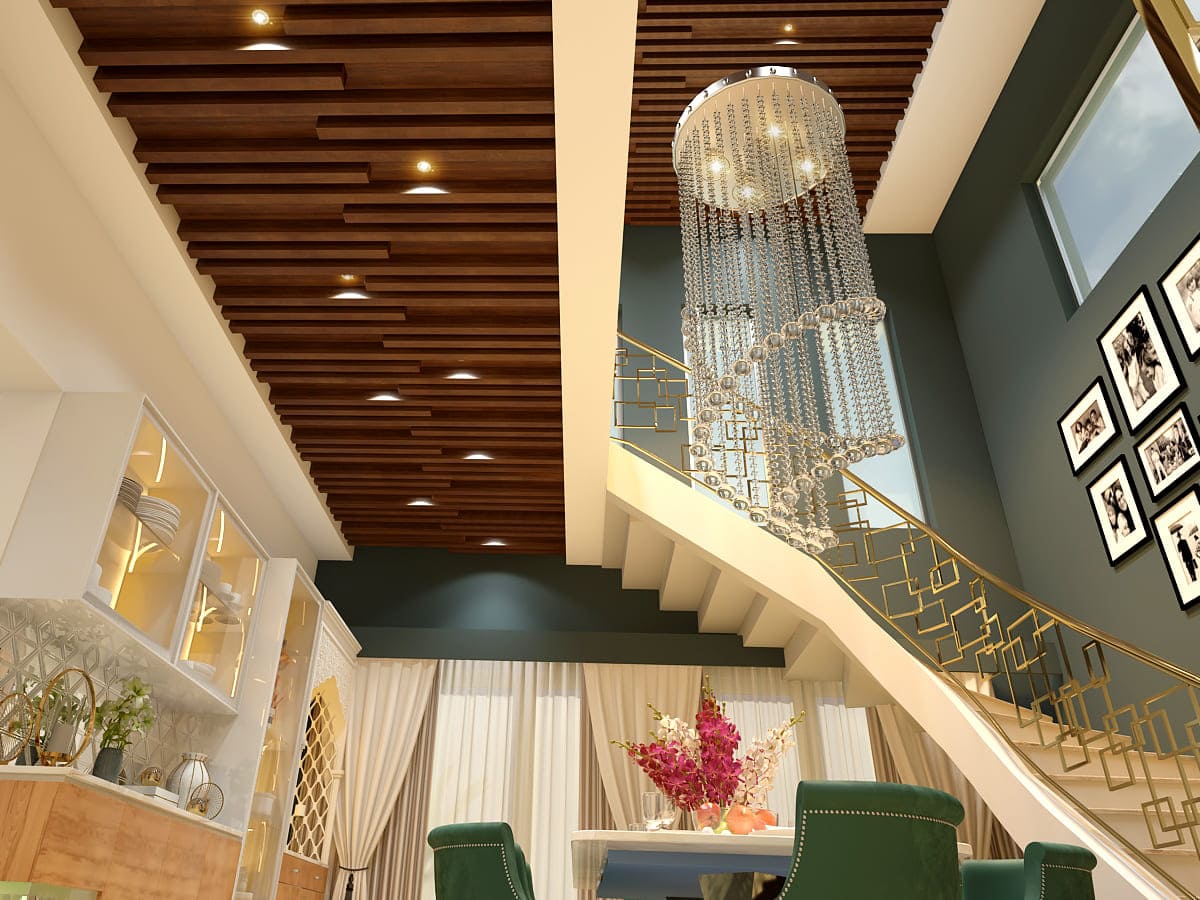This super spacious duplex demanded all the grandeurs of the universe. Golden tones with classy interiors, a modern and classical fusion in the study room. Abstract patterns, neat and spacious rooms with bold and glamorous interiors. A lovely dining area, mesmerising staircase next to a dark toned wall sprinkled with black and white frames, fresh blue carpet and deep green chairs. A fancy study room, super-spacious kitchen with all the amenities and a seductive living room. Red chairs with grey sofa, gold, white and brown interiors. A chandelier that showers sparkle, stole our heart. The vibrant kid’s bedroom turned out exactly as we intended, check out that cool map on their wall!