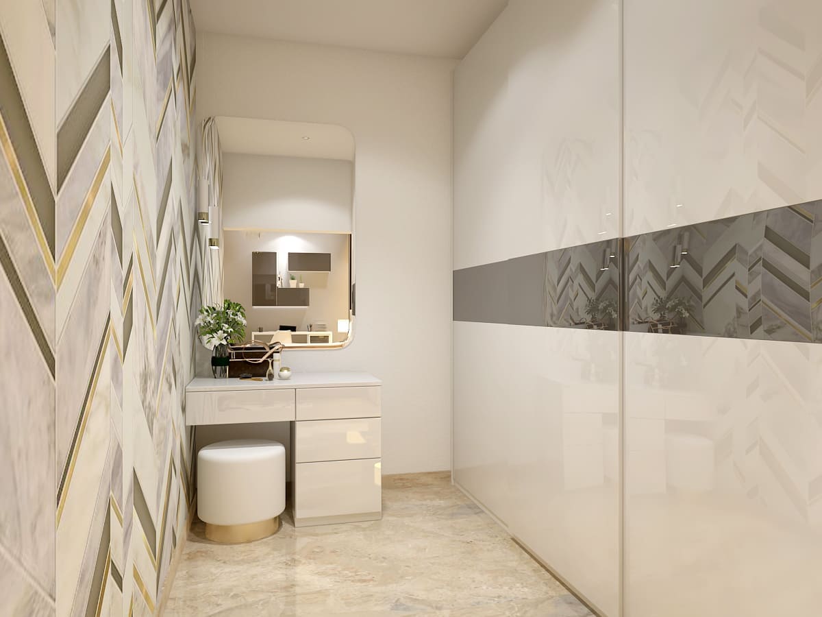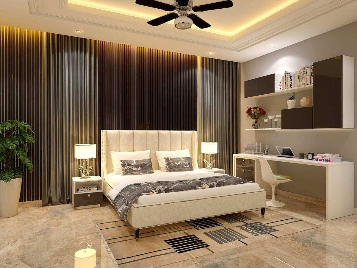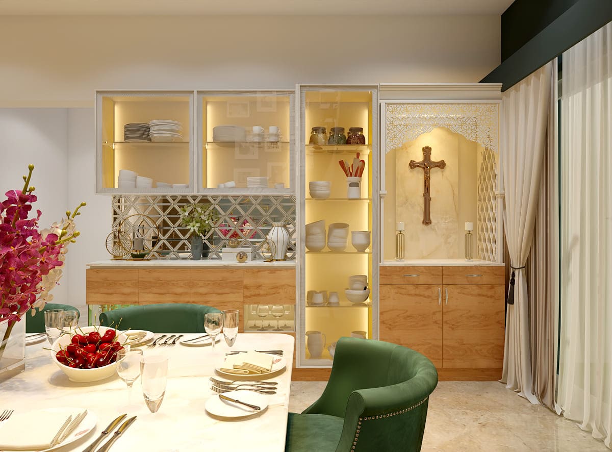 This super spacious duplex demanded all the grandeurs of the universe. Golden tones with classy interiors, a modern and classical fusion in the study room. Abstract patterns, neat and spacious rooms with bold and glamorous interiors. A lovely dining area, mesmerising staircase next to a dark toned wall sprinkled with black and white frames, fresh blue carpet and deep green chairs. A fancy study room, super-spacious kitchen with all the amenities and a seductive living room. Red chairs with grey sofa, gold, white and brown interiors. A chandelier that showers sparkle, stole our heart. The vibrant kid’s bedroom turned out exactly as we intended, check out that cool map on their wall!