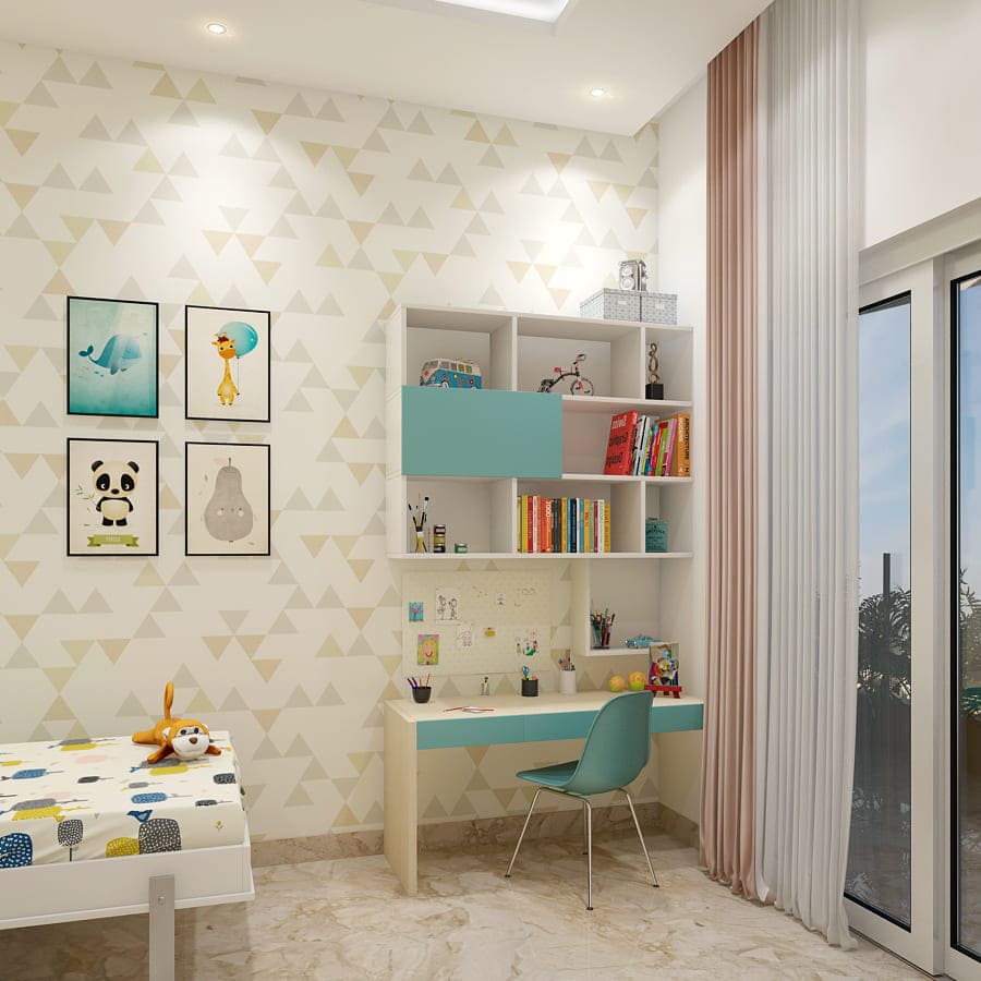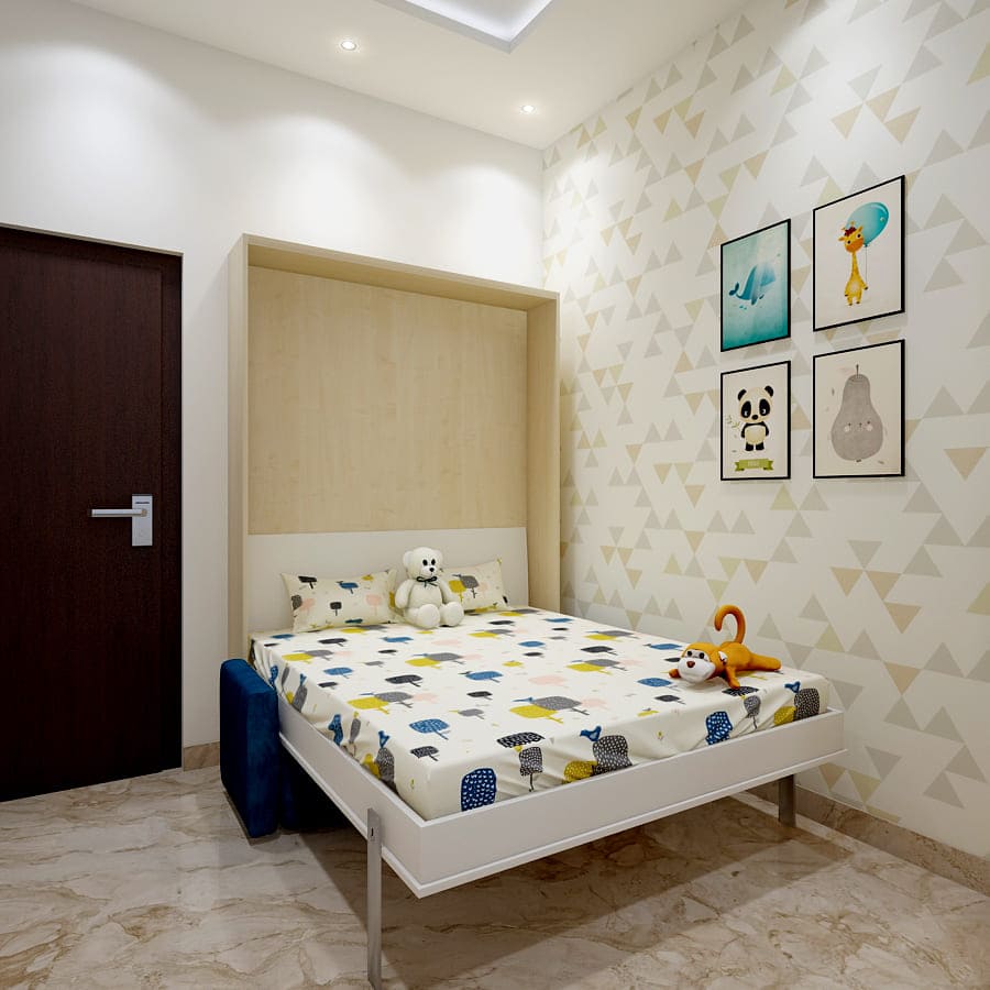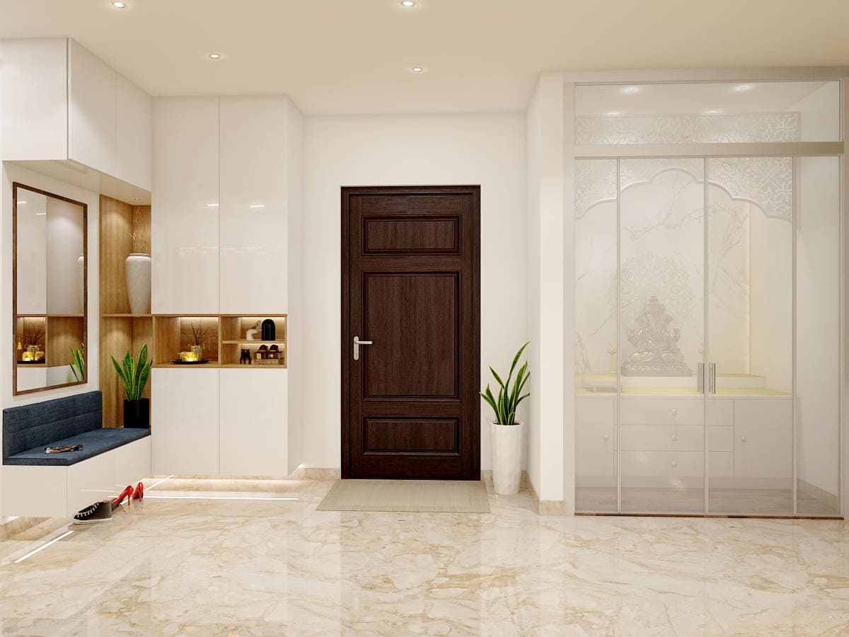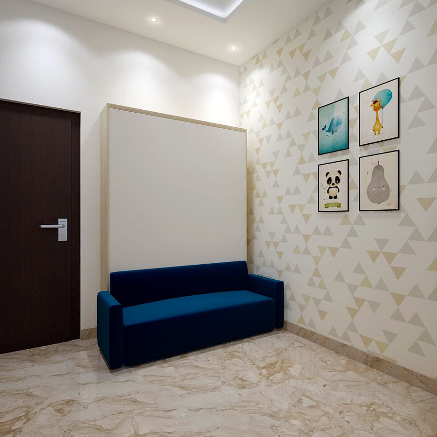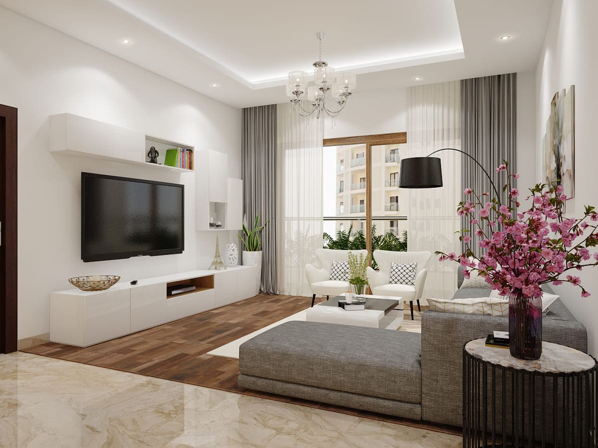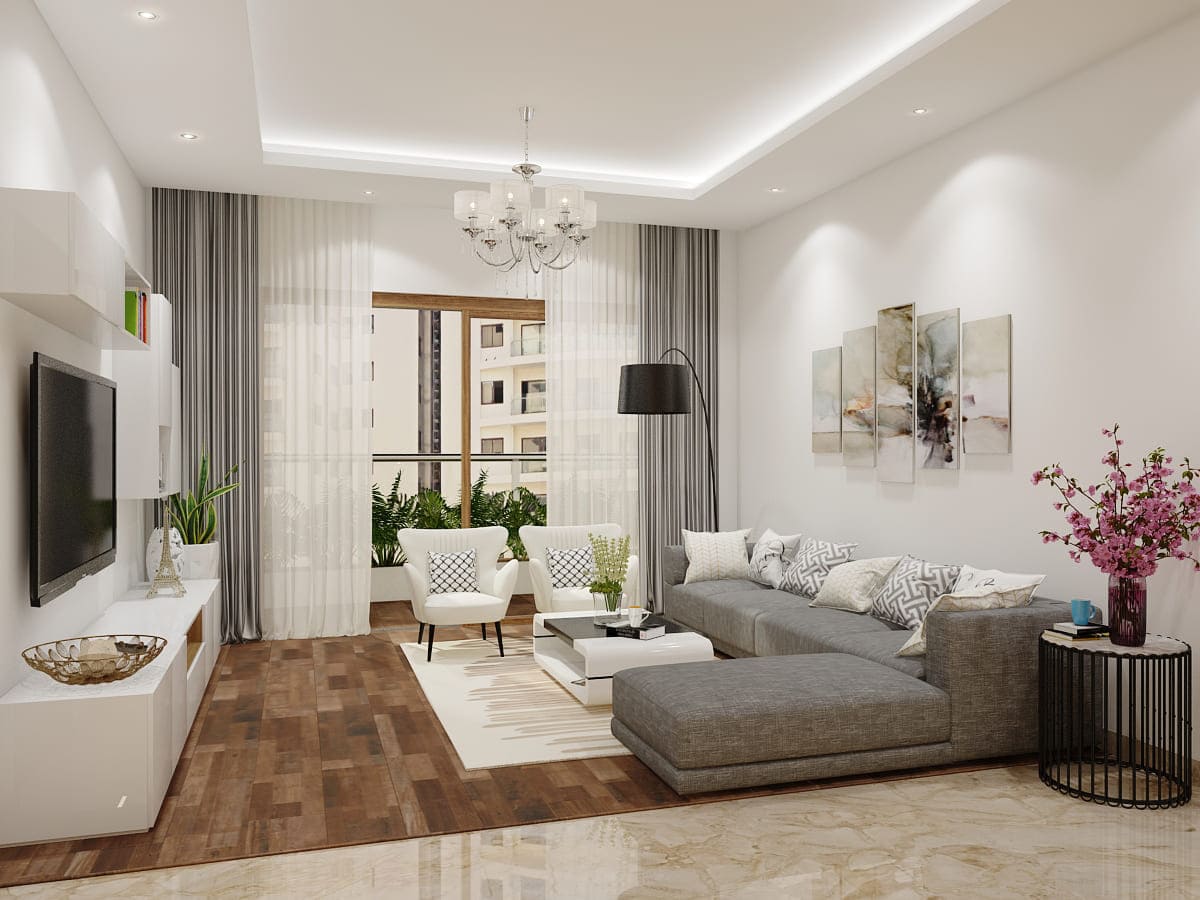 We turned every room into a white canvas to give that luxurious look with a tinge of brass and grey. The Italian marble flooring in cream, light rugs with a subtle design and colour, voila! Grey sofa with white and grey cushions to match the curtains and black floor lamp in the living room. A minimalistic approach in the bedroom with a sliding door used for the wardrobe and soothing white, grey and golden tones used everywhere. A spacious puja room where you can feel the serenity and peace as soon as you enter. Elegant chandeliers, cube clean modern furniture and stylish lamps. Personally, we kinda fell in love with the kitchen!