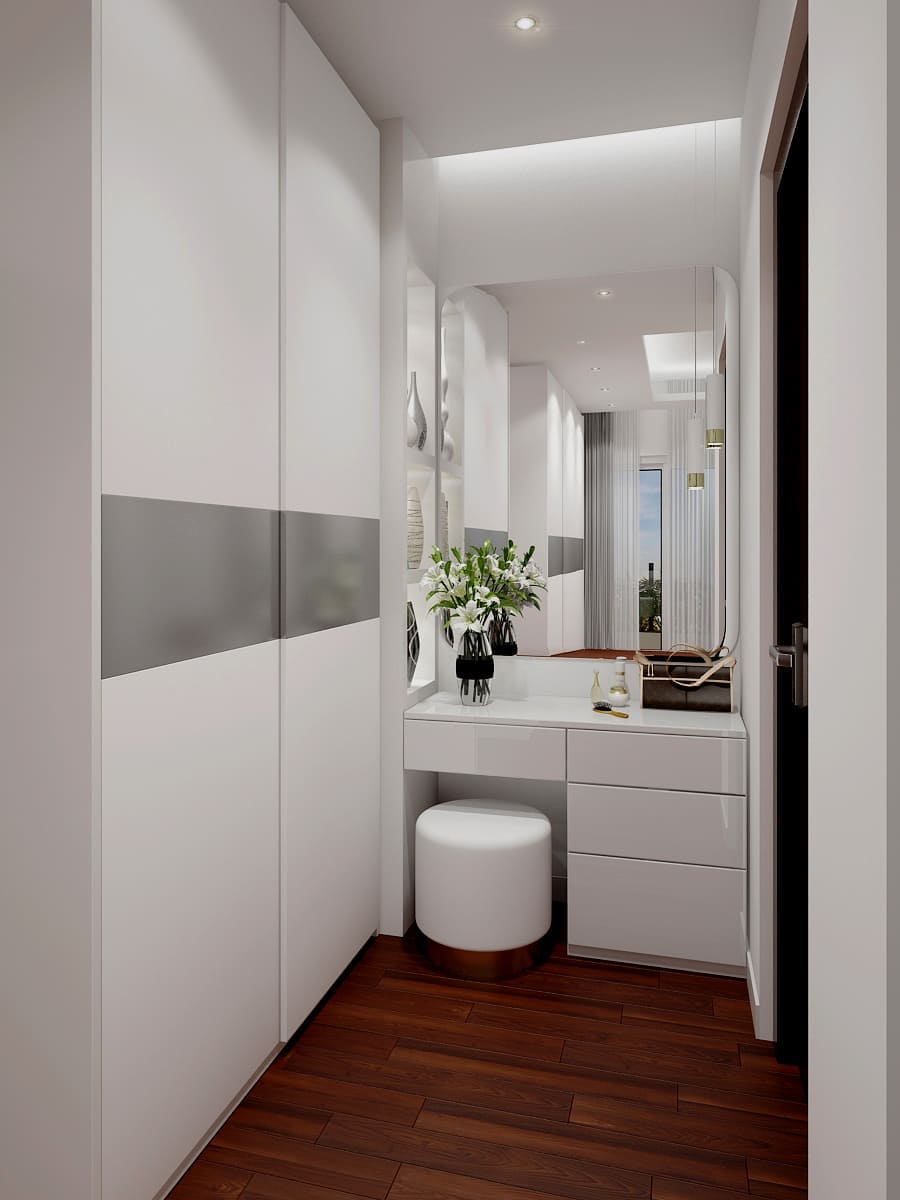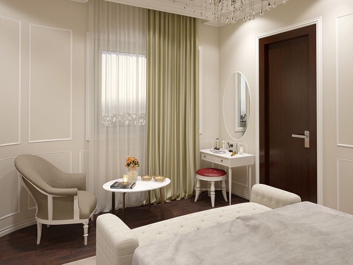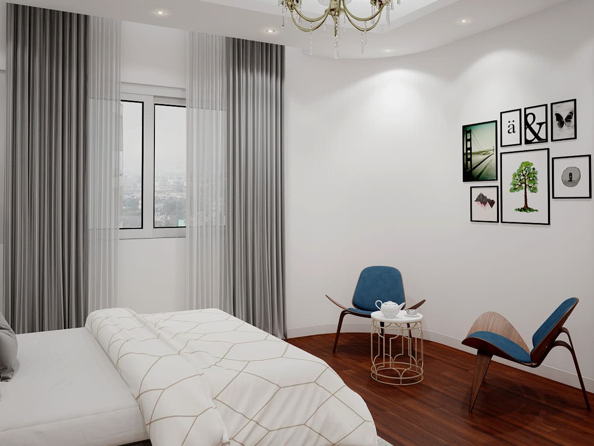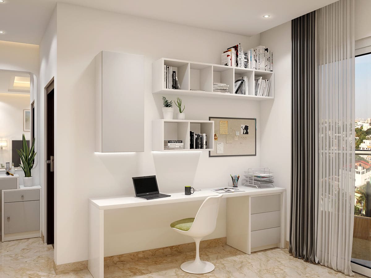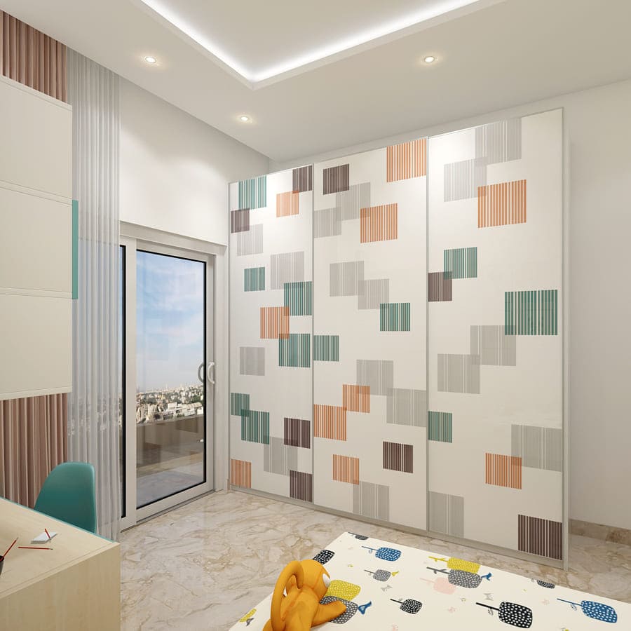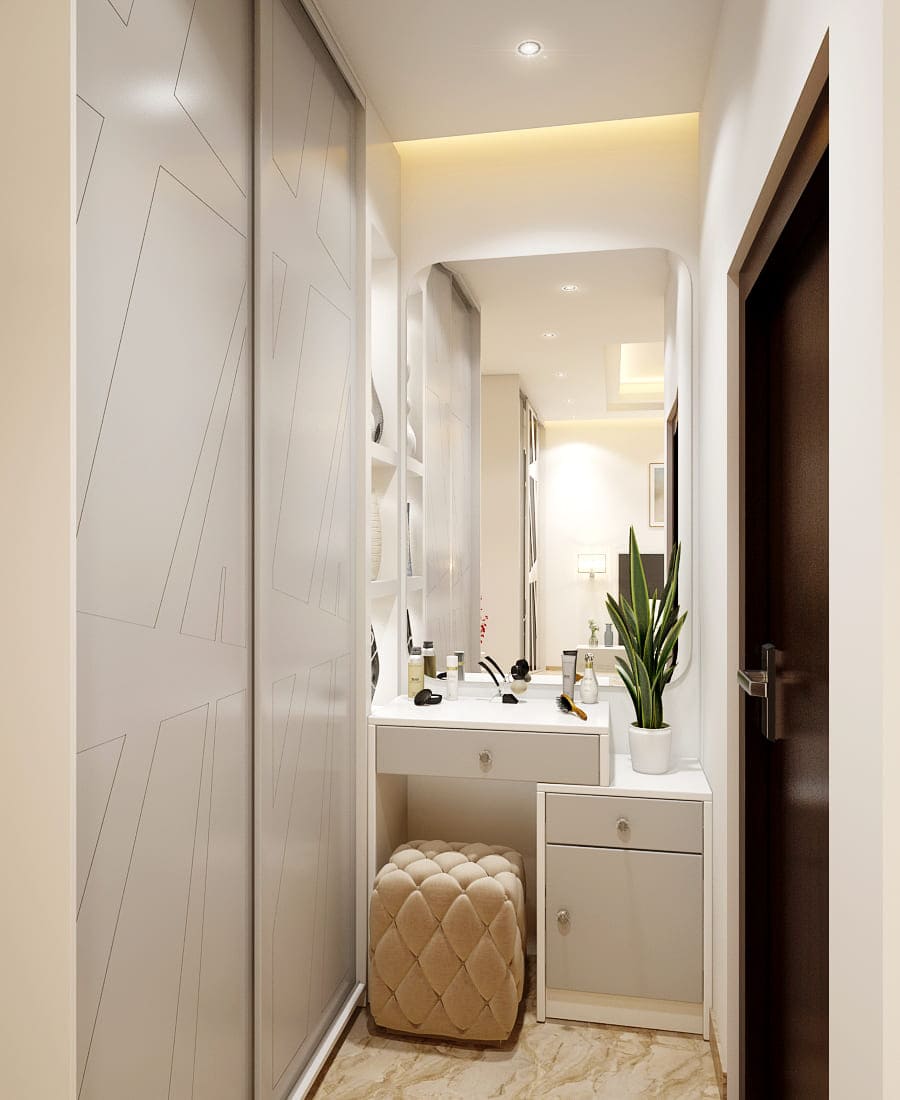 We turned every room into a white canvas to give that luxurious look with a tinge of brass and grey. The Italian marble flooring in cream, light rugs with a subtle design and colour, voila! Grey sofa with white and grey cushions to match the curtains and black floor lamp in the living room. A minimalistic approach in the bedroom with a sliding door used for the wardrobe and soothing white, grey and golden tones used everywhere. A spacious puja room where you can feel the serenity and peace as soon as you enter. Elegant chandeliers, cube clean modern furniture and stylish lamps. Personally, we kinda fell in love with the kitchen!