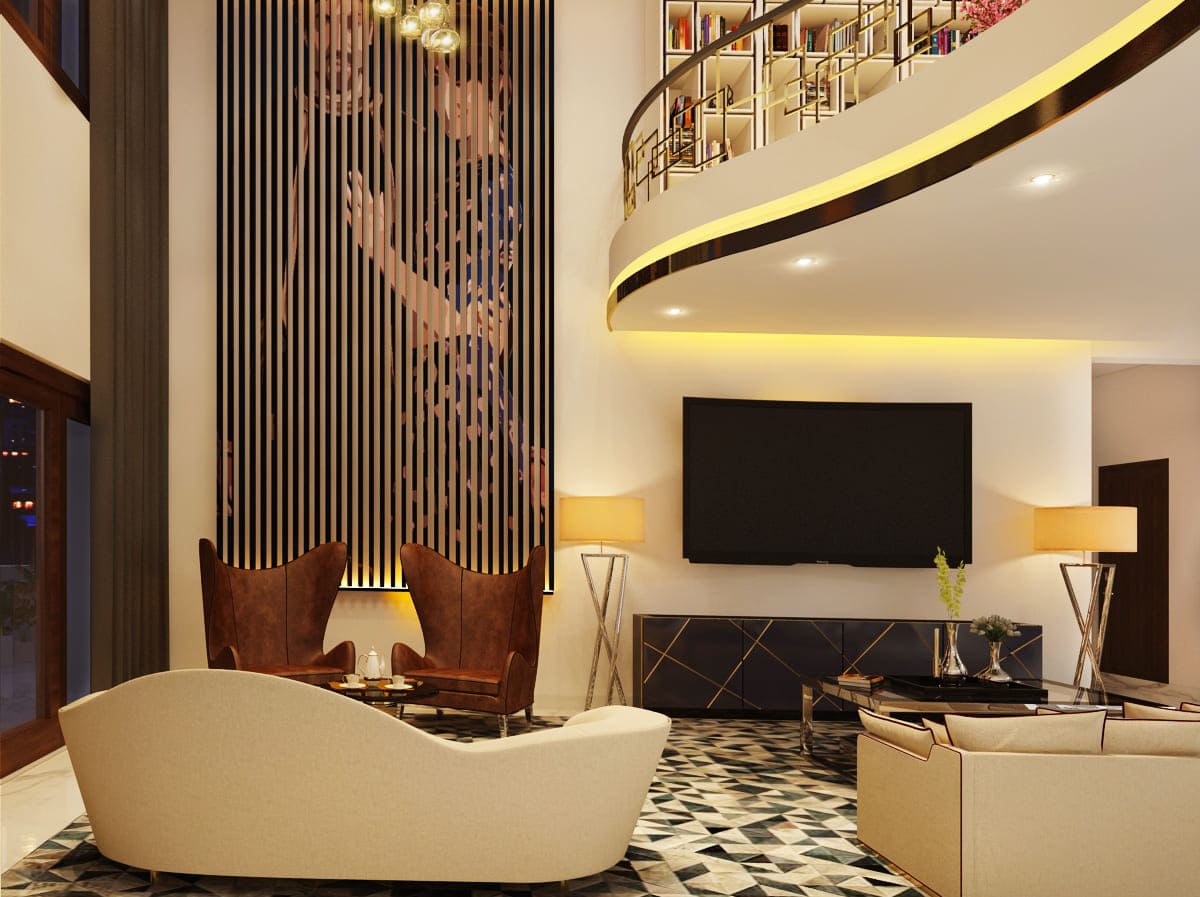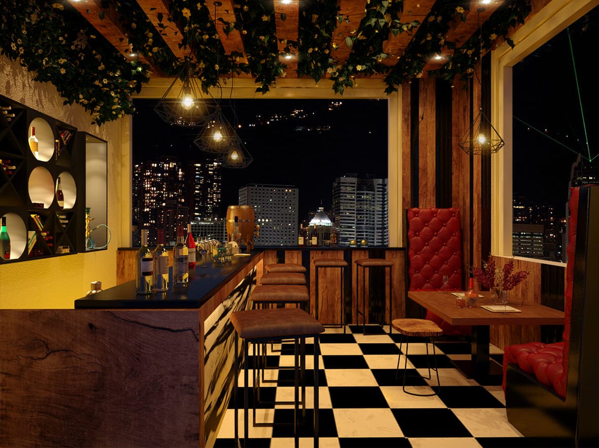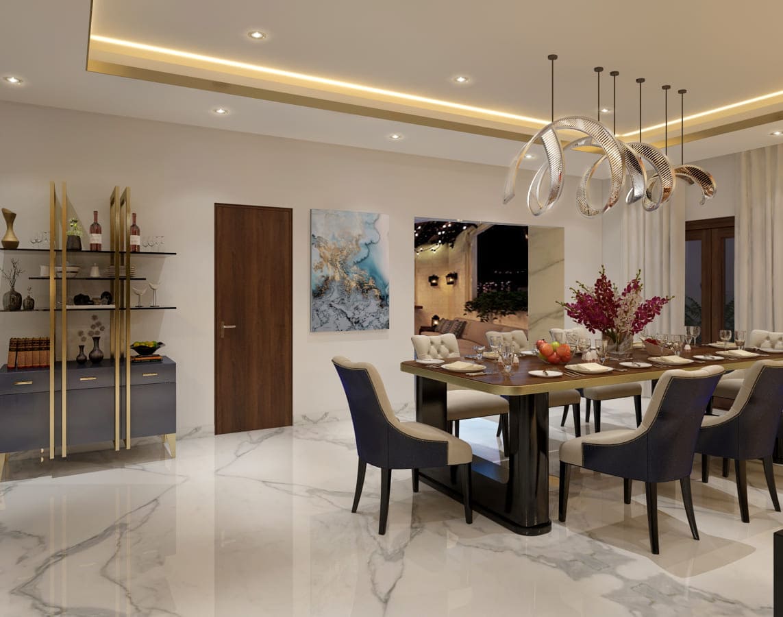 Feast your eyes on this grand casa! A marriage between luxury and glamour, DesignReify transformed the entire house into a dreamland. Every room has a different colour theme, each and every furniture piece or artefact chosen is dripping with a unique aura! We used a lot of gold tones, a dreamy green balcony and Chandeliers everywhere, even in bathrooms. Instagram-friendly porch, where nature meets style, antler inspired chandelier, tree log table and beautiful creepers. Lavish bar room to chill with high bar stools, long counter and rustic wood beams for the ceiling. We enjoyed designing every inch if this star-studded duplex penthouse, one of our best projects ever!